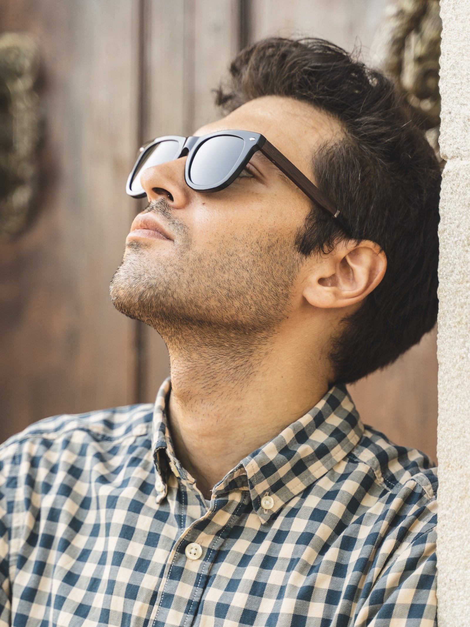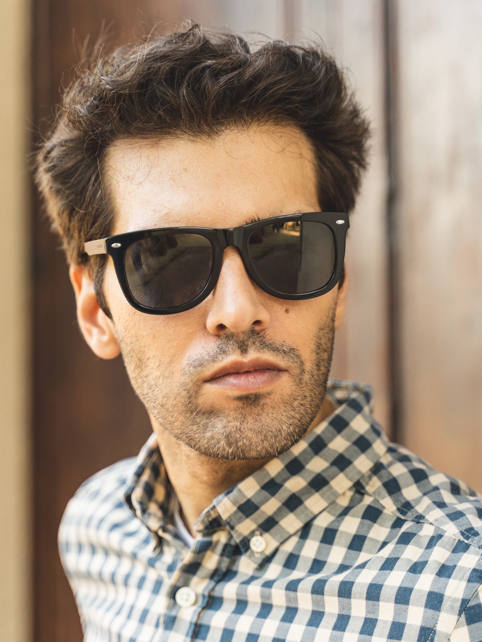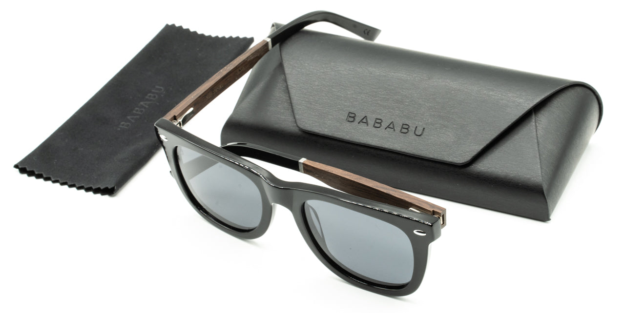Montura muy original gracias a su combinación perfecta de acetato negro y madera de ébano con embellecedores en metal y lentes de sol gris polarizadas.