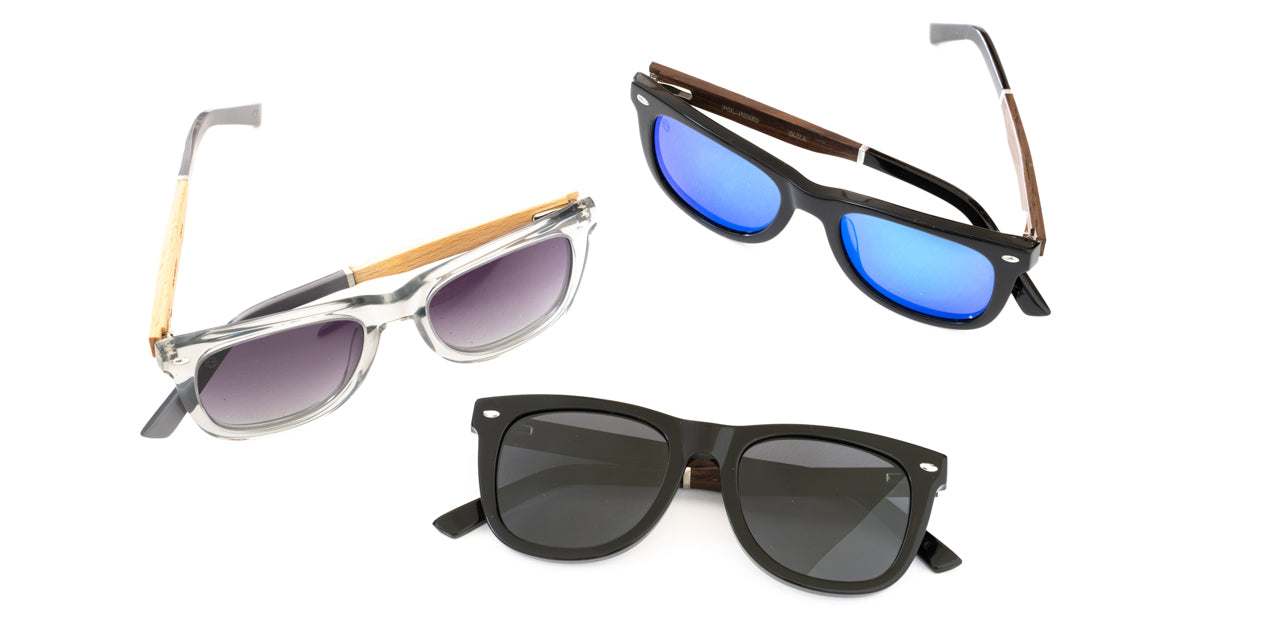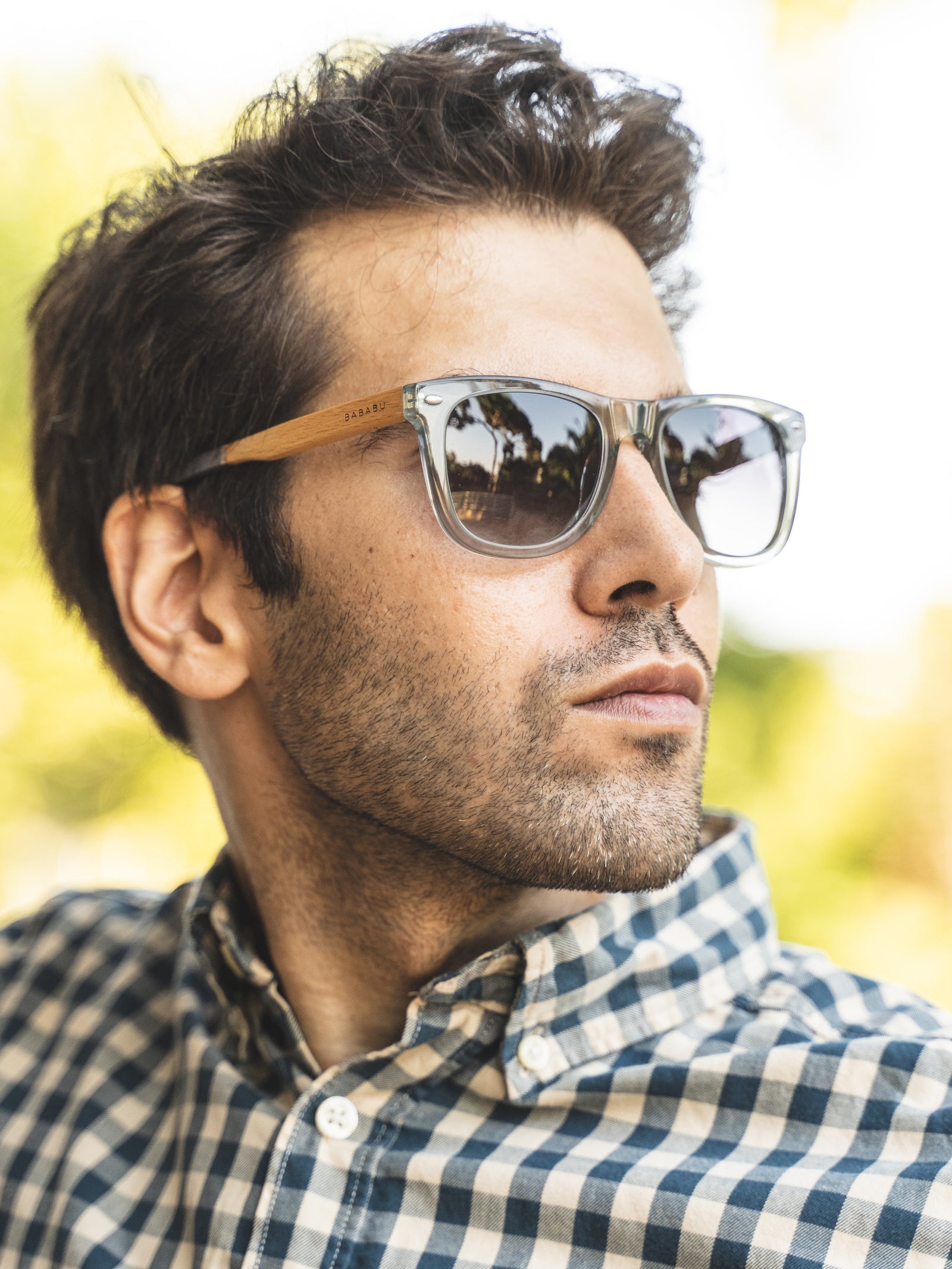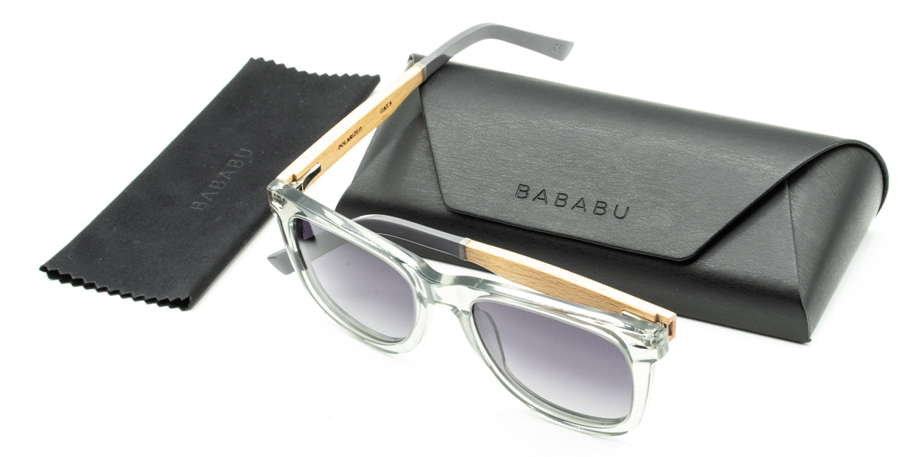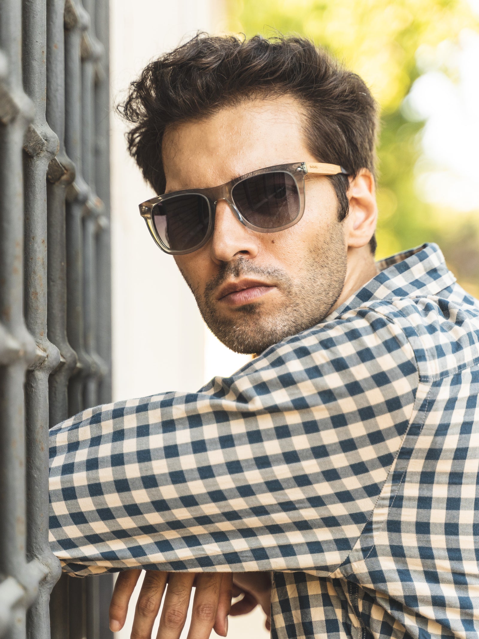 Montura muy original gracias a su combinación perfecta de acetato gris transparente y madera de ébano embellecedores en metal y lentes de sol degradadas en color gris polarizadas.