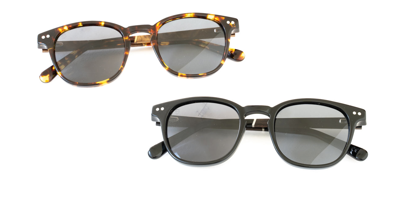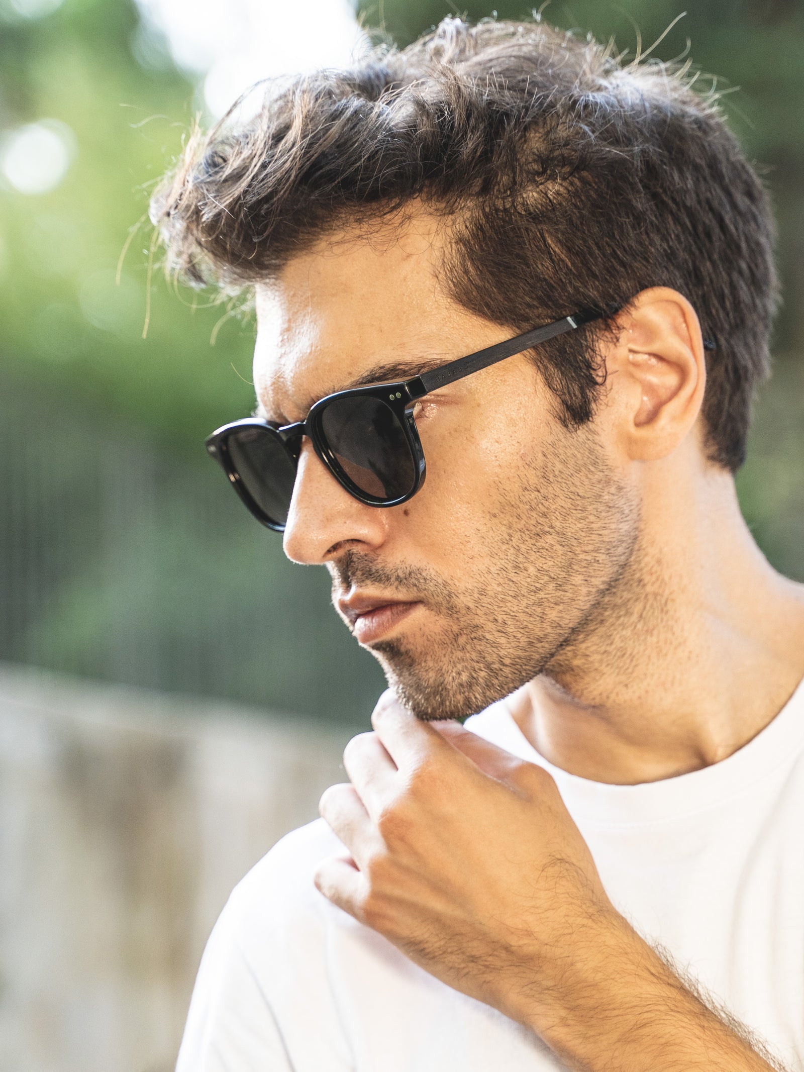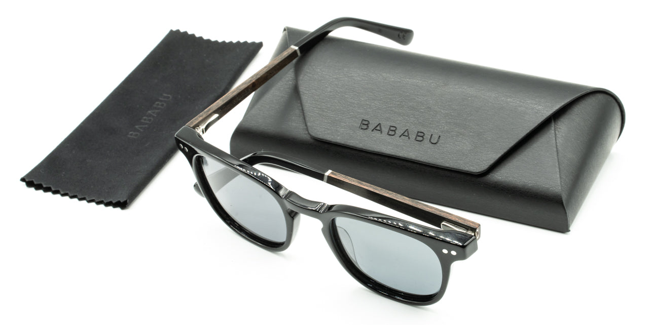 Montura que brilla con luz propia con puente cerradura que da un toque diferente, de acetato negro, varillas de madera de ébano, pequeño detalles en metal y lentes de color gris polarizadas.