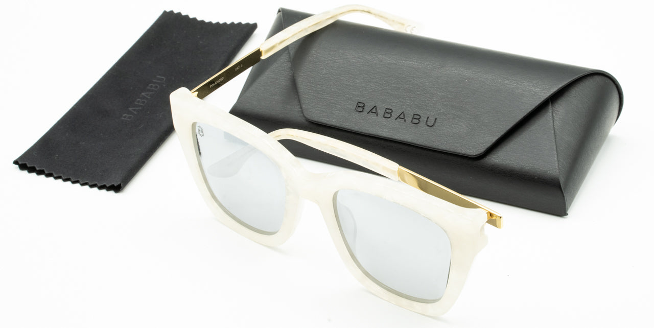 Montura con mucho glamour con combinaciones perfectas como la de acetato blanco, varillas de metal dorado y lentes de sol espejadas gris polarizadas.