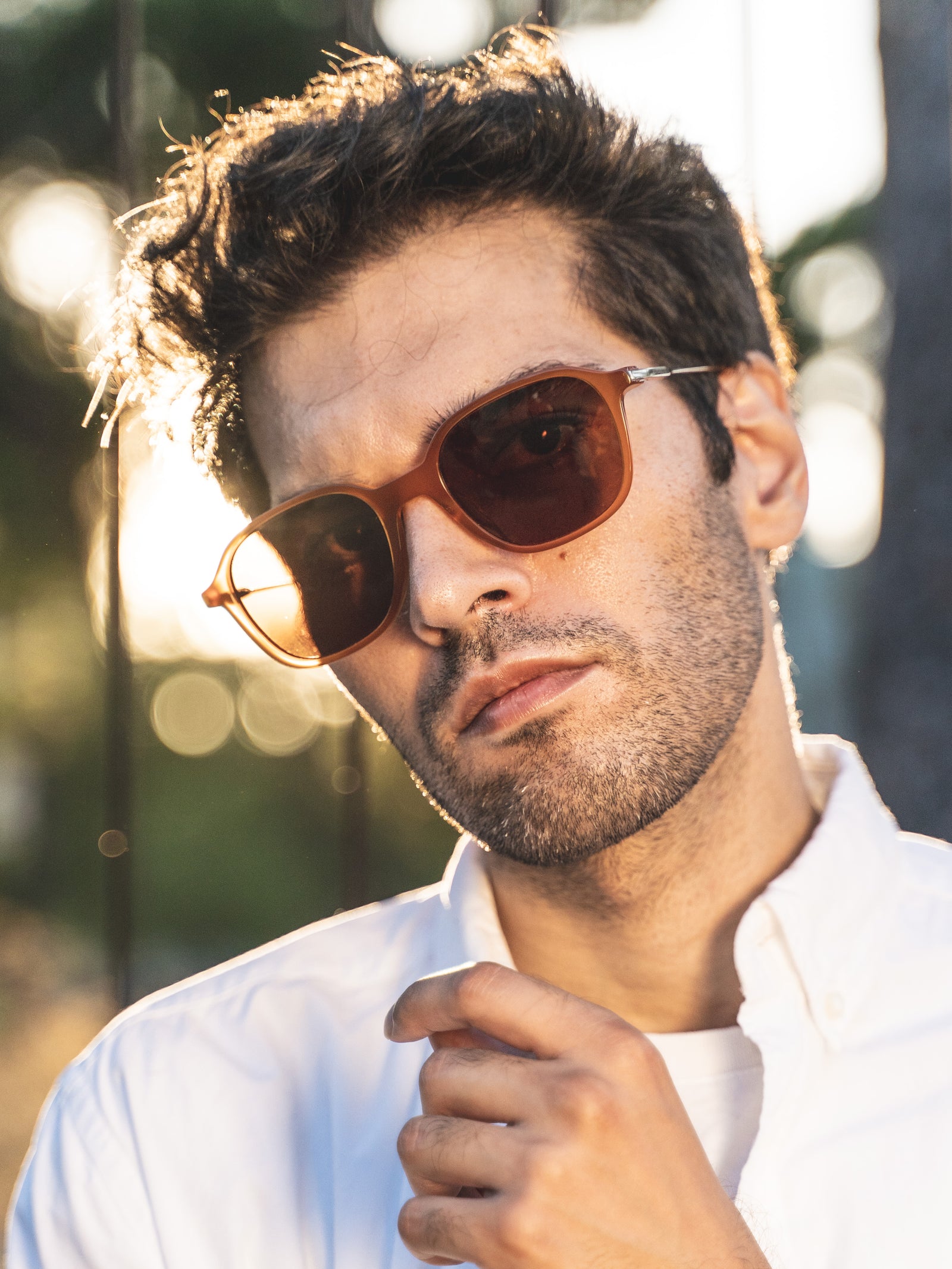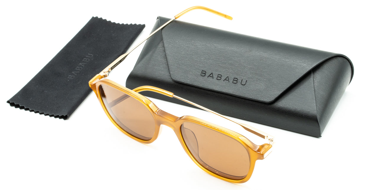 Montura con un toque de dulzura que encaja perfectamente gracias al acetato en color miel, varillas en metal dorado y lentes en color marrón polarizadas.