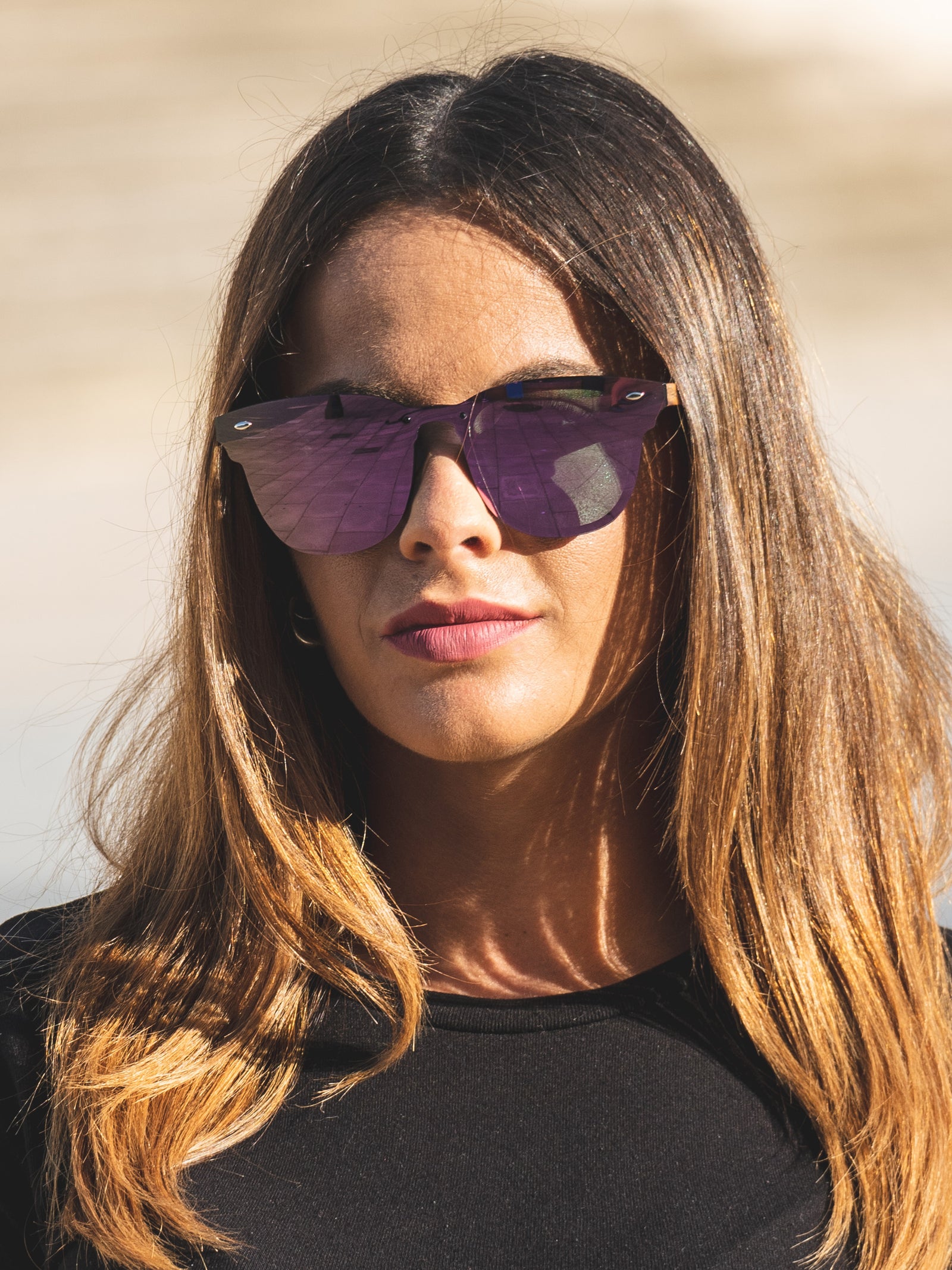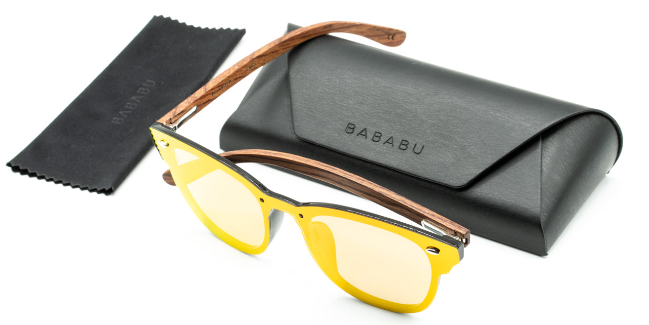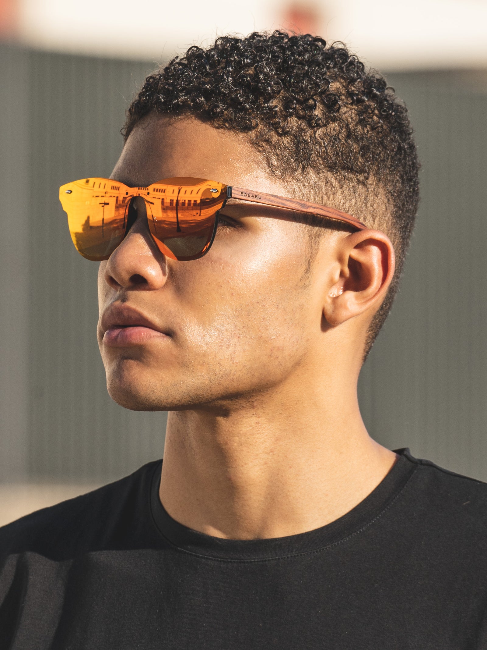 Montura que refleja tu estilo propio, destaca por su lente completa espejadas de color naranja polarizada con originales varillas de madera de ébano y pequeños embellecedores en metal.