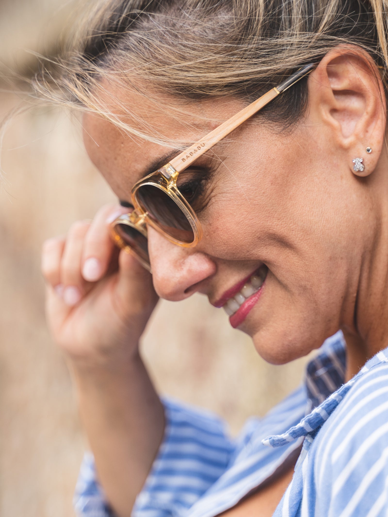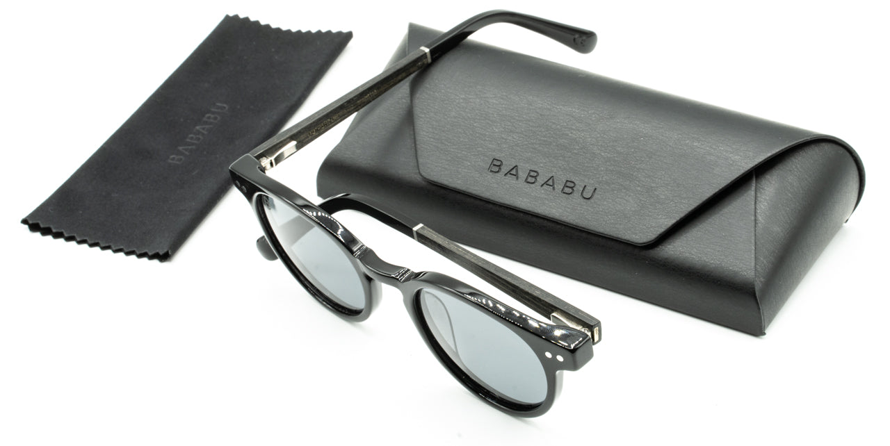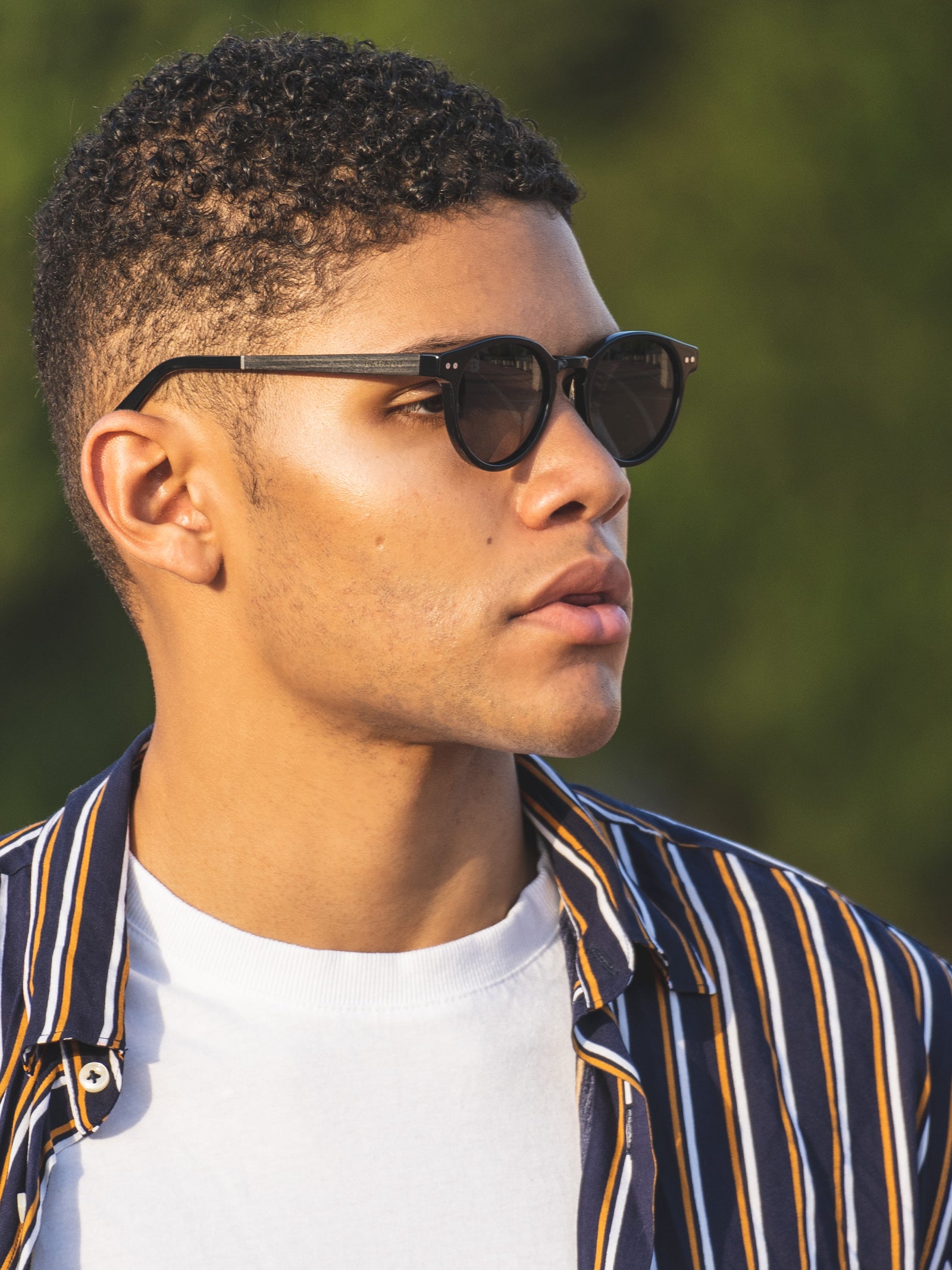 Montura estilo ovalada caracterizada por su sencillez y forma, de acetato negro, varillas de madera de ébano con pequeños embellecedores de metal y lentes de sol gris polarizadas.