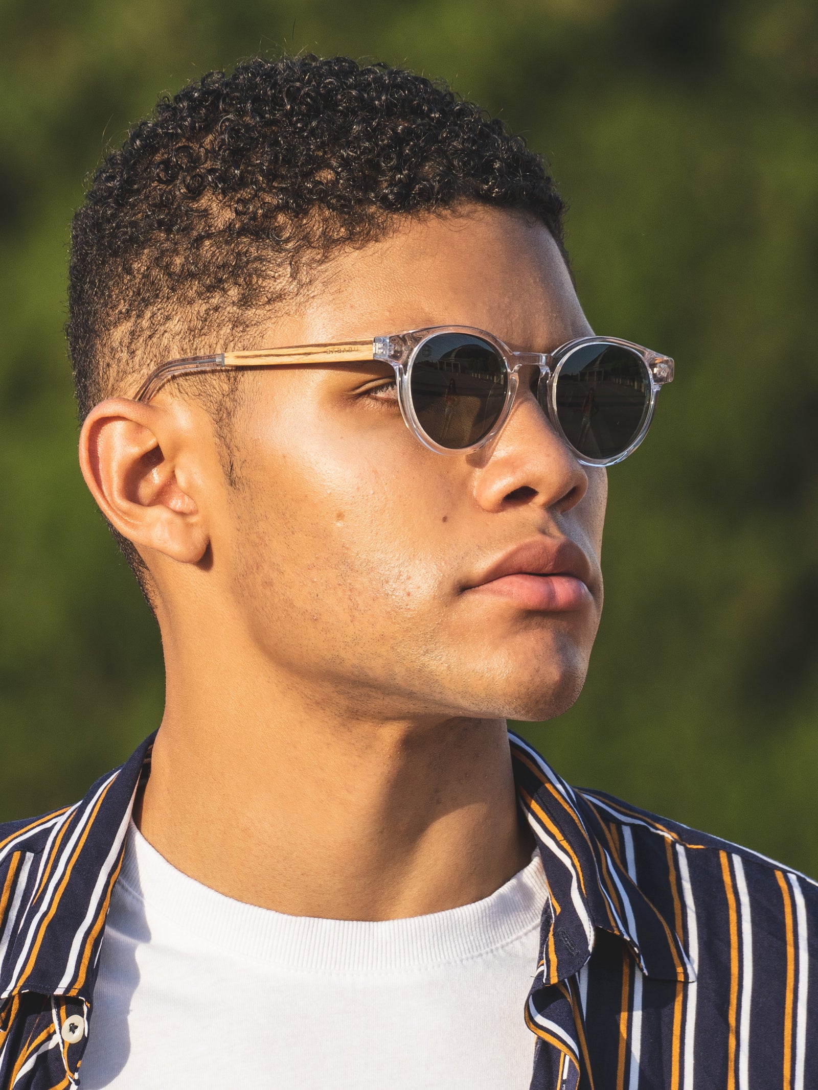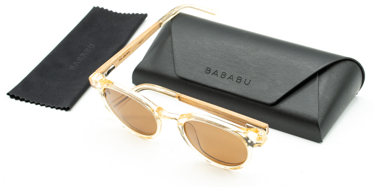 Montura estilo ovalada caracterizada por su sencillez y forma, de acetato marrón transparente, varillas de madera de ébano con pequeños embellecedores de metal y lentes de sol gris polarizadas.