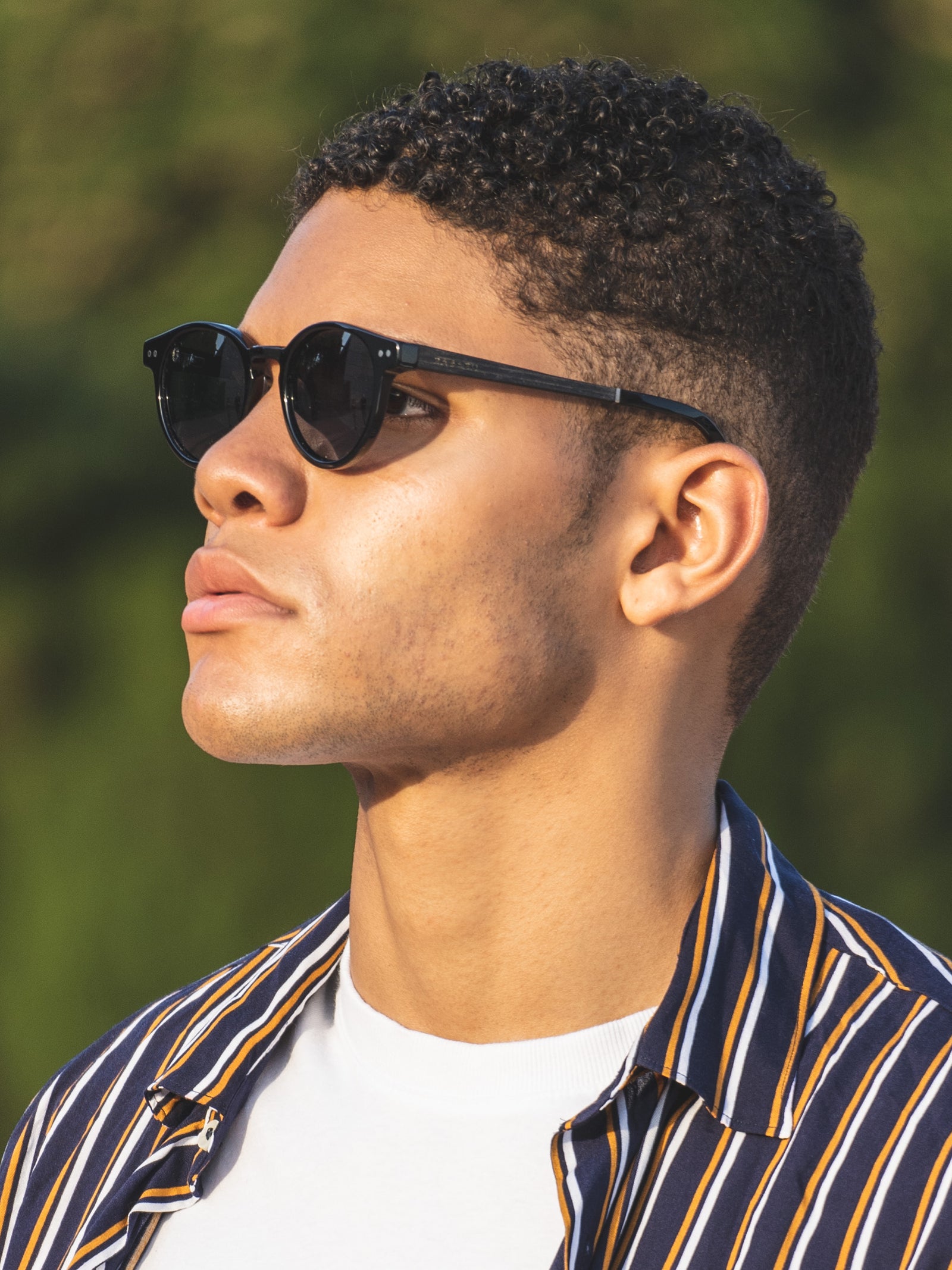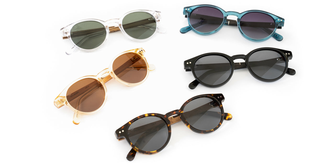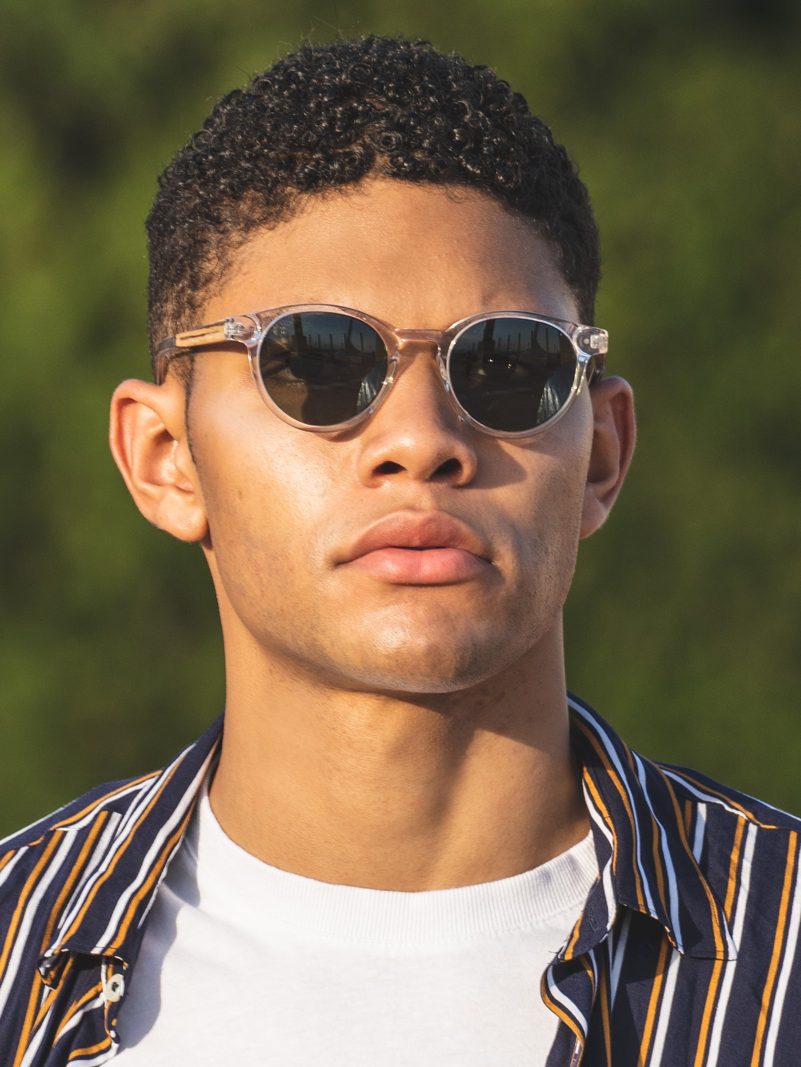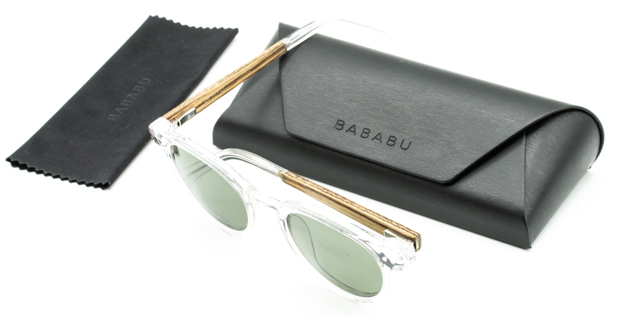 Montura estilo ovalada caracterizada por su sencillez y forma, de acetato transparente, varillas de madera de ébano con pequeños embellecedores de metal y lentes de sol gris polarizadas.