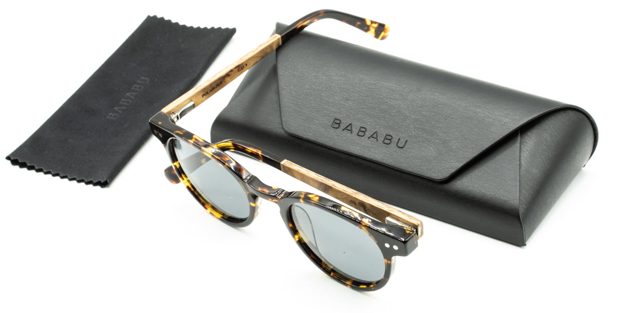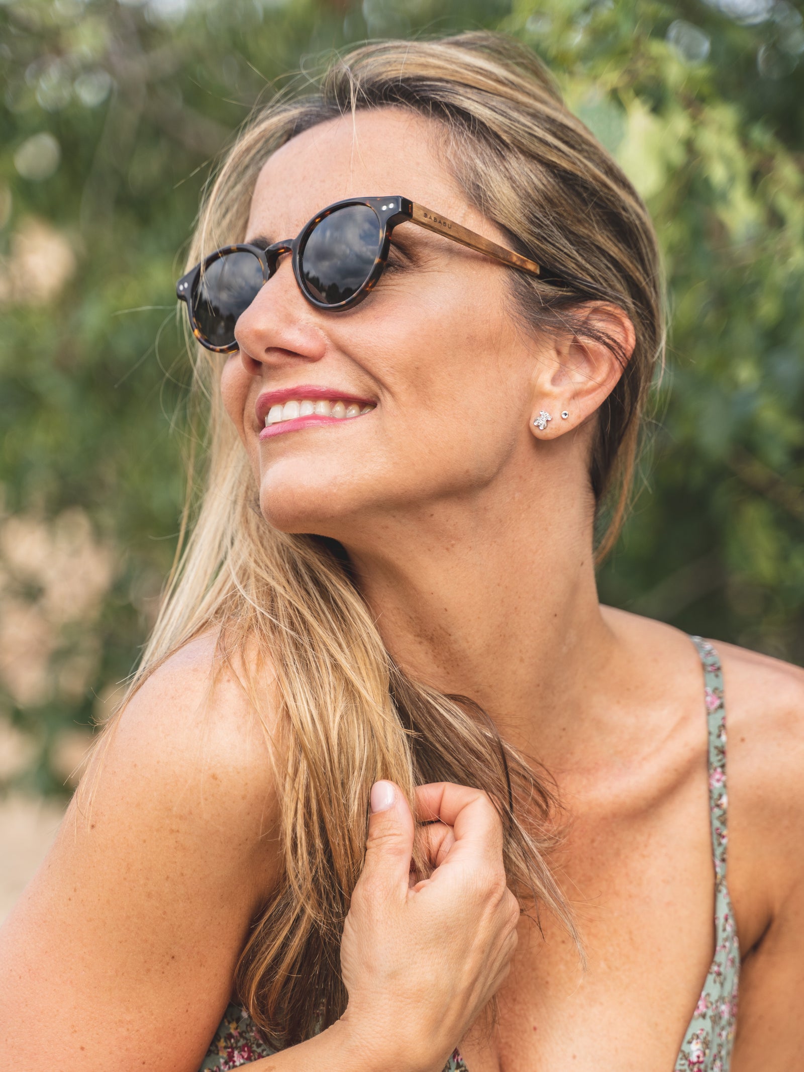 Montura estilo ovalada caracterizada por su sencillez y forma, de acetato marrón carey, varillas de madera de ébano con pequeños embellecedores de metal y lentes de sol gris polarizadas.