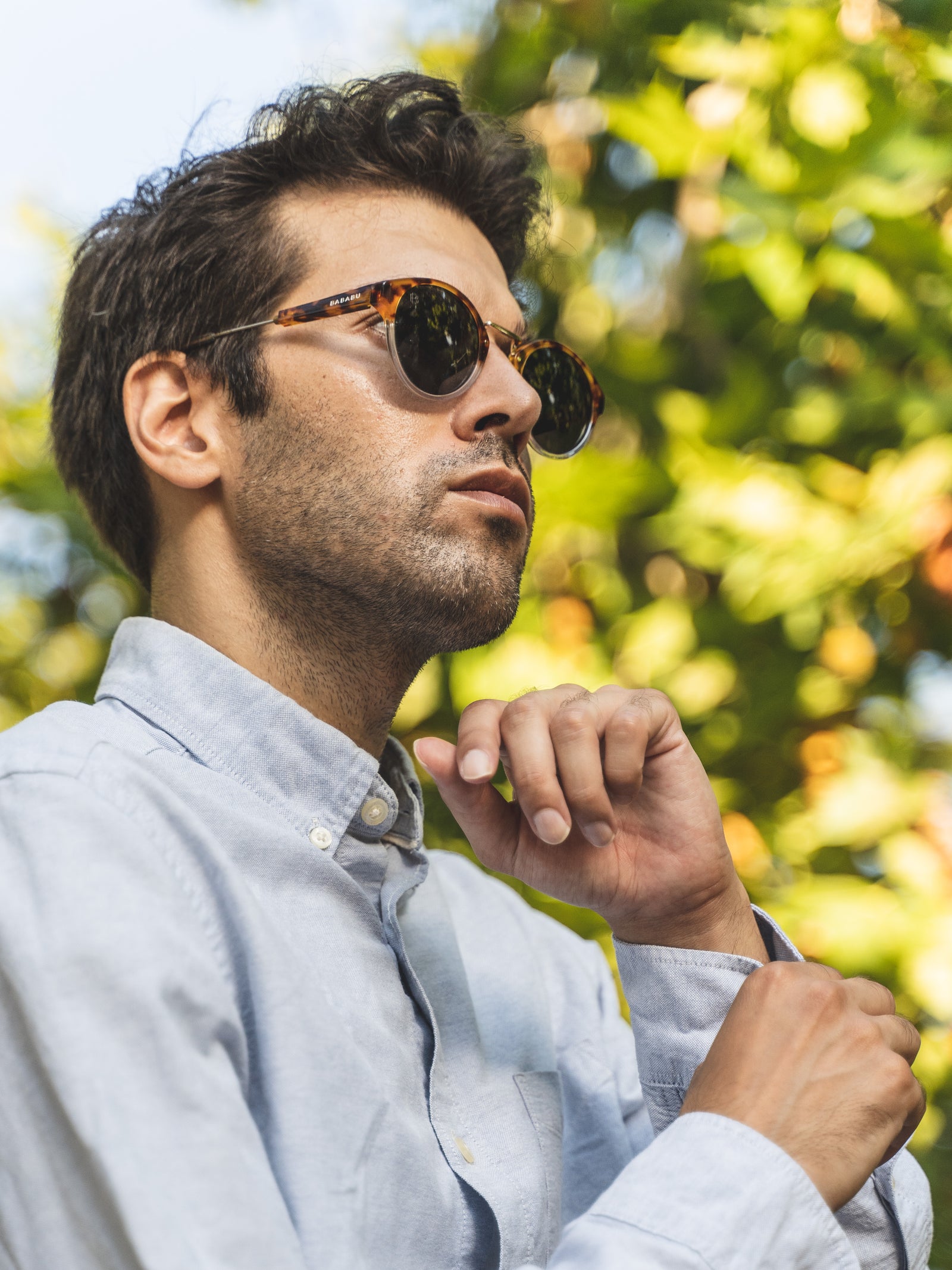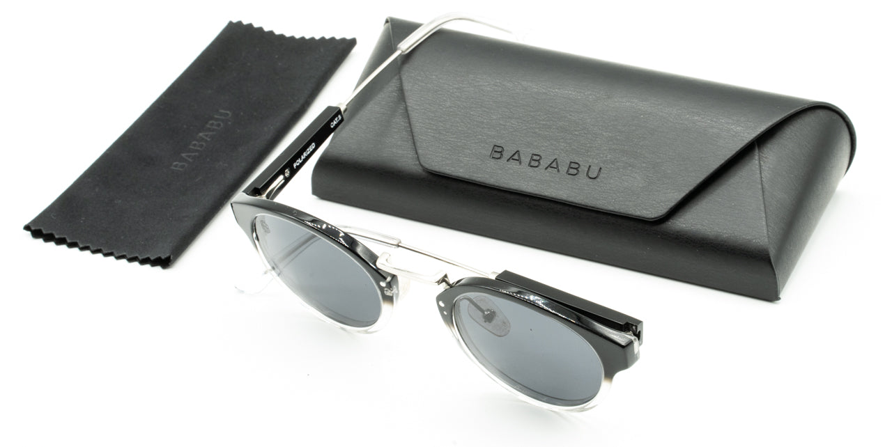 Montura salvaje con un estilo moderno que enloquece, de acetato negro y mitad transparente, puente de metal plateado, plaquetas de silicona y lentes de sol gris polarizadas.