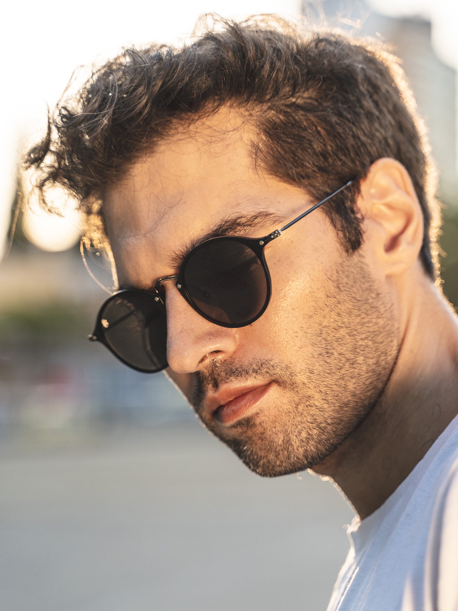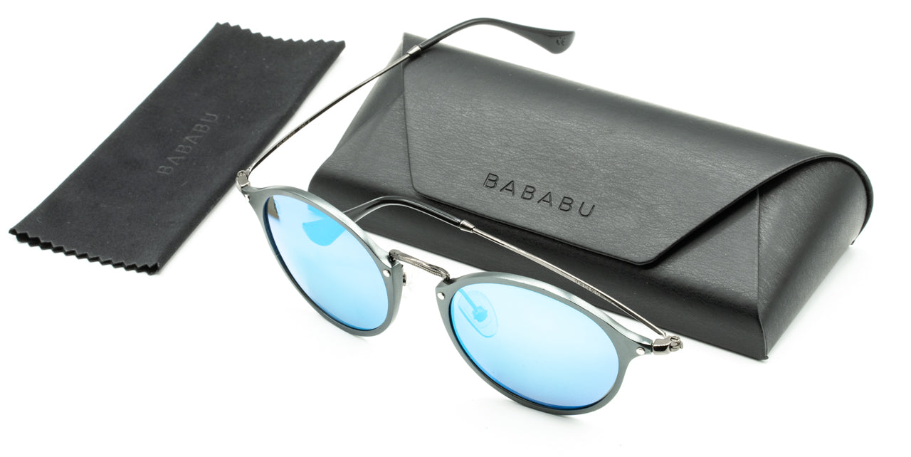 Montura redonda con un estilo muy contemporáneo de acetato gris, puente y varillas de metal y lentes de sol espejadas de color azul polarizadas.