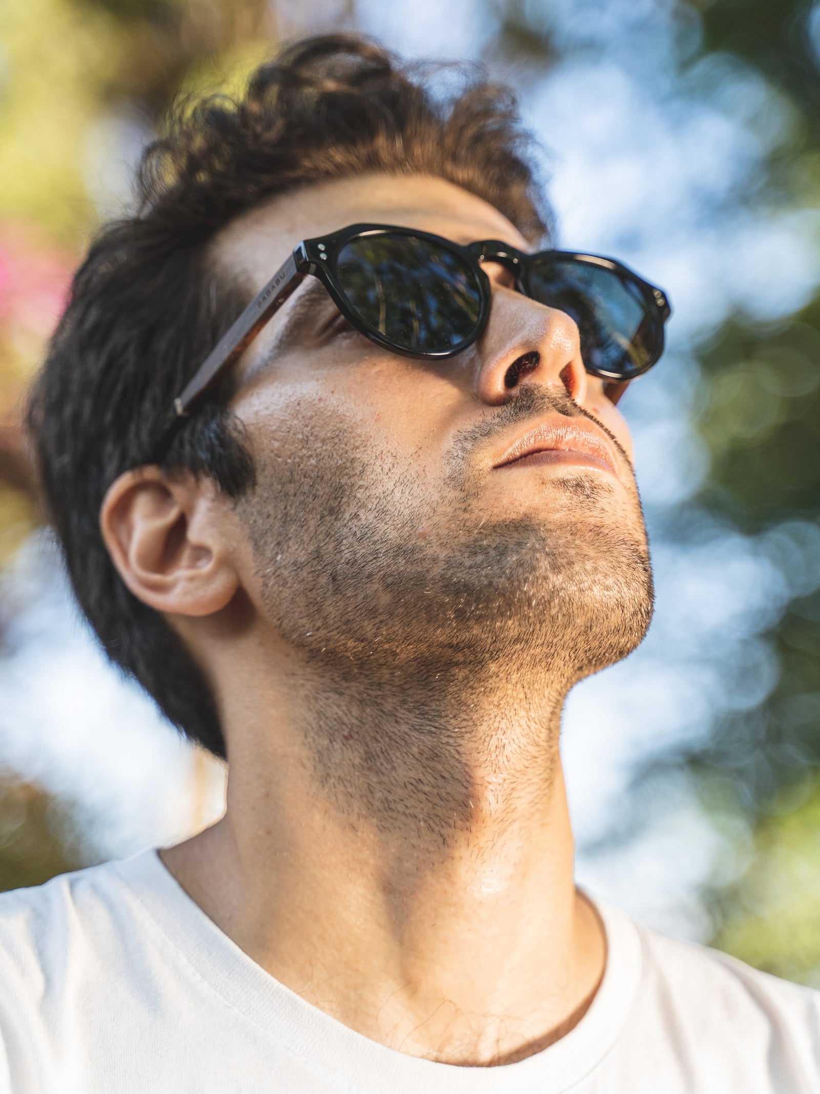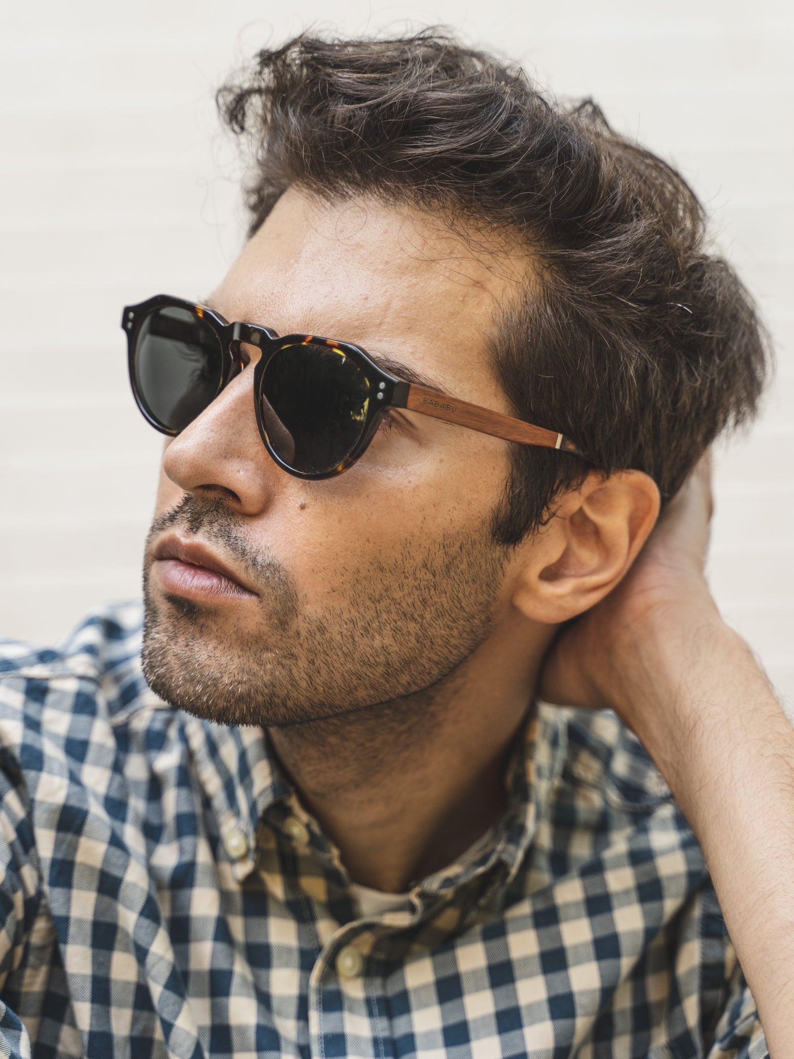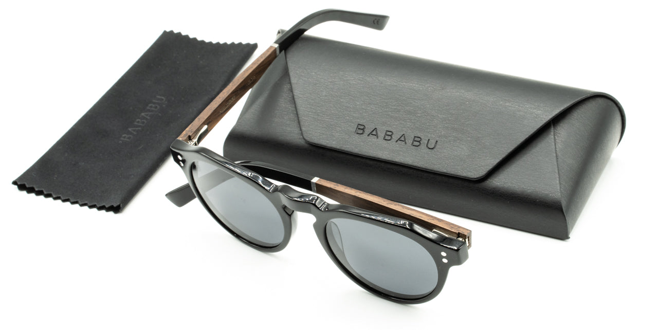 Montura con mucha fuerza gracias a su originalidad, de acetato negro, varillas de madera de ébano, embellecedores de metal y lentes de sol degradadas gris polarizadas.